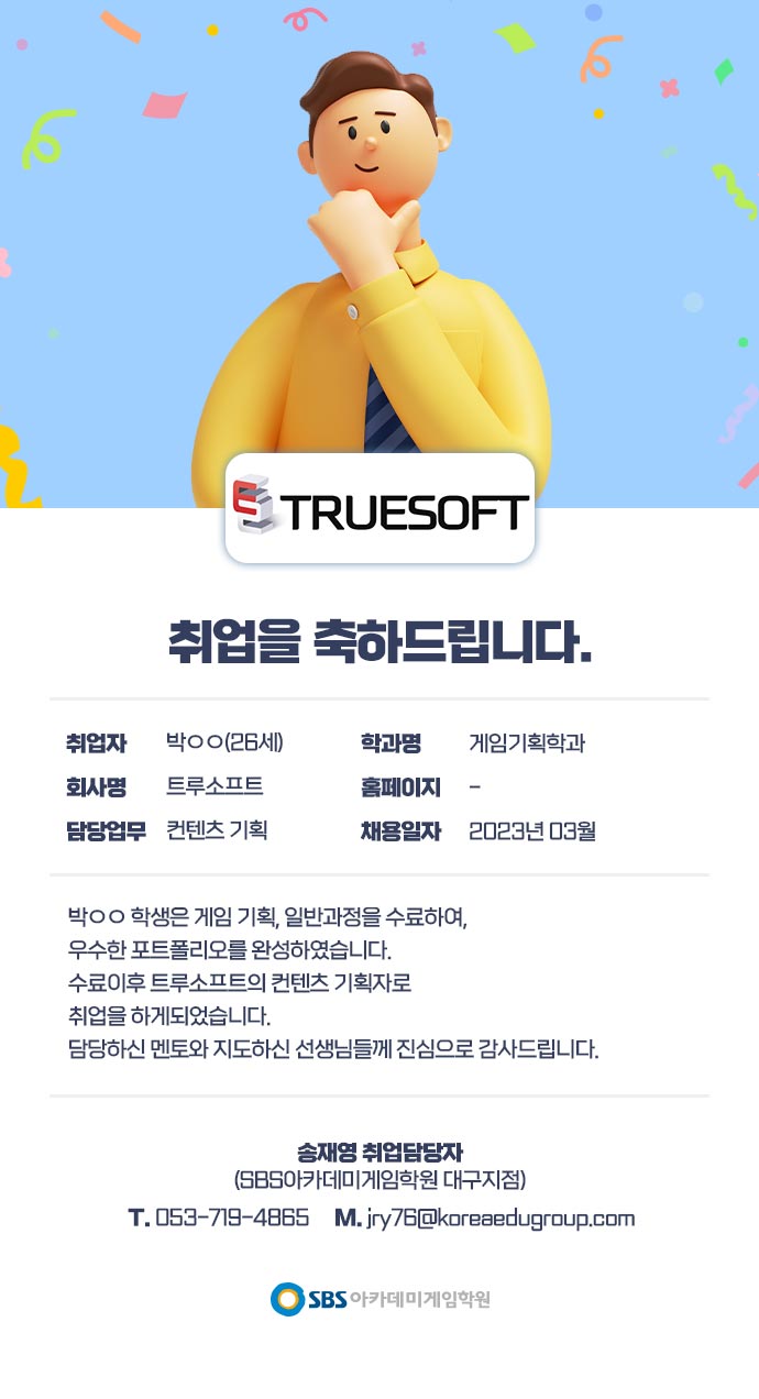 ※ 현재 SBS아카데미게임학원은 개인정보를 제3자에게 제공하지 않습니다.